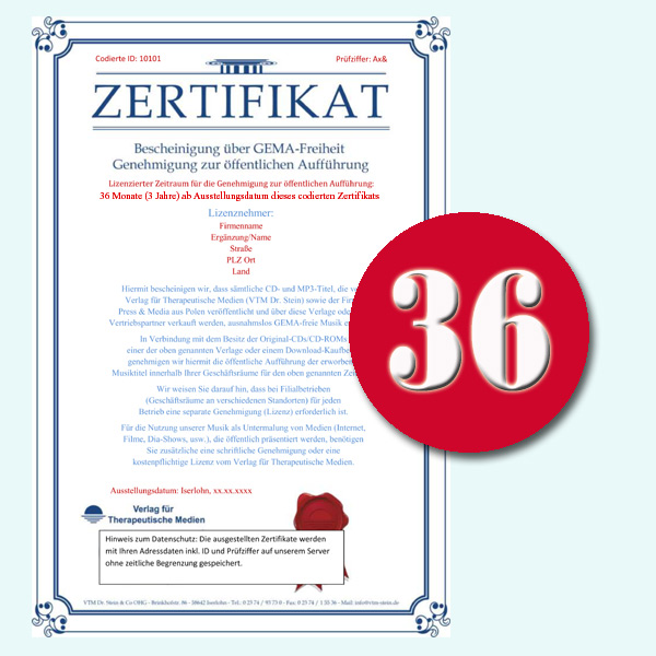 Mit dem angebotenen Zertifikat können Sie die Musik aus unserem Shop legal, unkompliziert und kostengünstig für die Dauer von 36 Monaten nutzen.